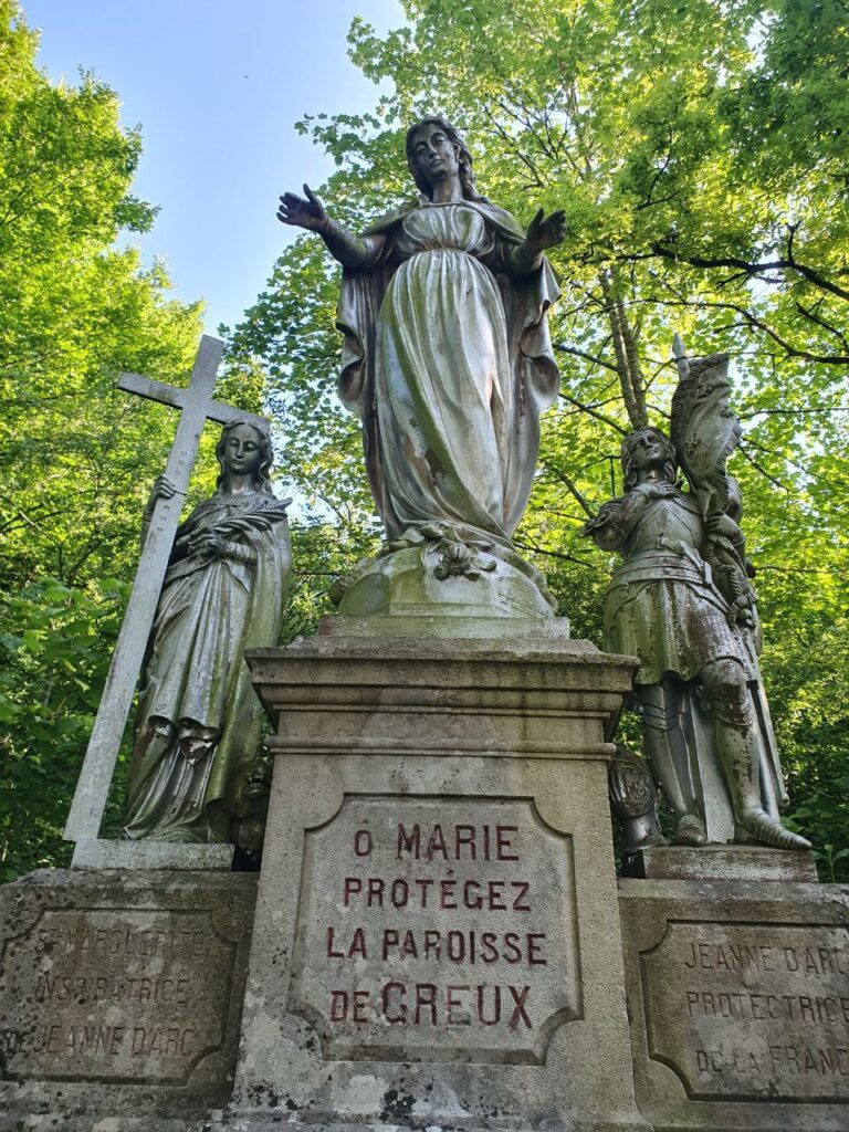 A Greux, village principal près de Domrémy, se trouvait l’église où Jeanne venait régulièrement prier. Sur l’emplacement de l’église, aujourd’hui disparue, un monument rappelle le passage de Jeanne.